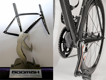 GOOMAH 事實上一家自行車服裝公司是不可能在內部自行開發, 從草圖到完美, 高功能性的騎乘裝置, 如G.731. 達到這傑出品質的關鍵字就是通路-經由ASSOS全球獨特通路提供可用的資源及整合能力和技術訣竅. 為何選擇碳纖維? 它是一種合成材料就像ASSOS織品的主要材料一樣. 要製作G.731, 由找尋適當的纖維開始, 而這正是ASSOS織品研究室的專長! 發展的過程, 車架的工程及實體原型的製作被分配到歐洲一組碳纖維專家, 經常為美洲盃賽事(America’s Cup), 摩托車 GP(Moto GP)及GT1耐力賽開發及創造前衛的碳纖維零件.每一個環節, 每一個零件G.731的都由專家設計, 評估及檢驗. 這是經由23個技術純熟的個人分工每個創作的環節-從纖維和環氧樹脂模具, 到製模鑄造, 幾何學, 數學, 空氣動力學, 材質疲勞測試, 元件, 手工製作, 組裝, 烤漆, 性能測試到提供一個完全舒適的騎乘經驗-都是由Goomah完成. 結論-G.731-提供了許多學識與樂趣, 許多刺激, 而且可能更多, 這決定了這個開發團隊決定形成它自己的, 獨立的瑞士自行車工程公司叫Goomah SA, 以便有可能進一步參與在自行車車架的創造. 而ASSOS擁有Goomah SA少數股權.