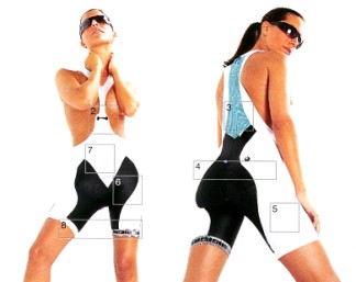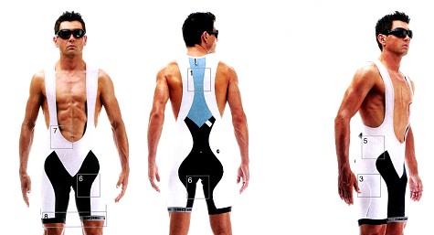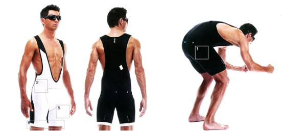 FI.13 Lady_S5 1. 符合女性人體工學內墊 2. ABC – 吊帶系統 3. 背部淡藍色的碳纖維網層 4. AEPD- 人體工學的六片式比賽型剪裁 5. 側邊A430布料 6. 內墊A431布料 7. 前半部高彈性布料 8. 包裝: 熱壓成型的盒子內含小罐雪米霜, 清潔劑, 洗衣袋與使用手